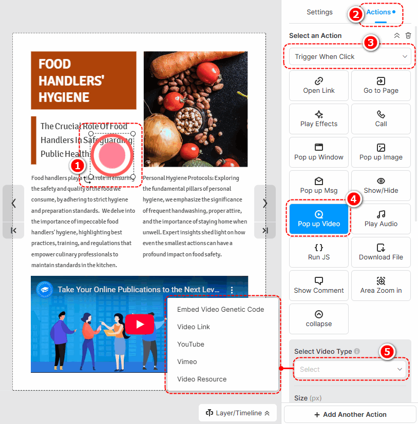 Haga clic en un elemento en el lienzo -> haga clic en [Comportamiento] in the properties panel -> select a triggering timing -> [Vídeo emergente] -> select a video type
